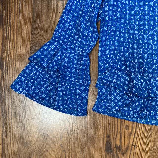 W) blue w/ white geo, LS bell, keyhole back